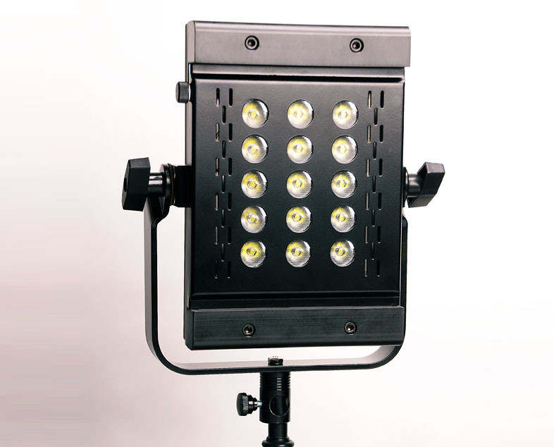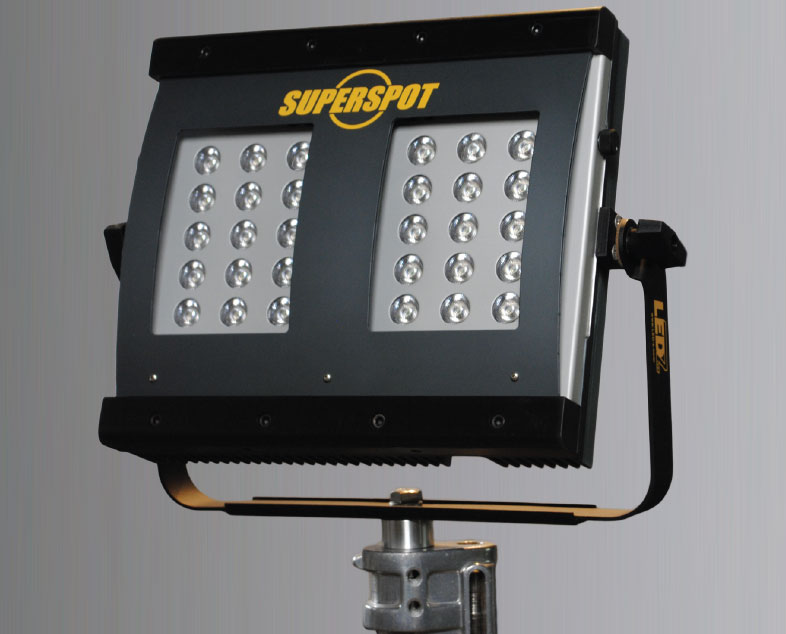 The LEDZ SUPERSPOT is the first in a premiere line of sharp, powerful circular beam producers. With a throw that easily exceeds 40 feet, the SUPERSPOT is comparable to current 575w HMI fixtures, including the 5500k color temperature whilst only drawing a single amp. The LEDZ SUPERSPOT is extremely robust with an all aluminum housing and yoke system with junior mounting pin. It has a slim profile so can be used in a multiple of lighting setups utilizing minimal space. The fixture produces no sound and very minimal heat, making it studio friendly. There are two built in dimmers on the fixture which allow for 100% - 0 output control with minimal color shift. The LEDZ SUPERSPOT comes complete with a switchable power supply unit 110v-240v AC, extension cable with on/off switch. There are additional accessories available including the LEDZ Speedframe, Chimera, filter frame, DMX capabilities and 12v battery options for mobile applications.